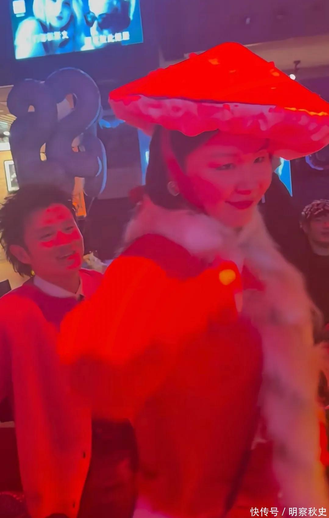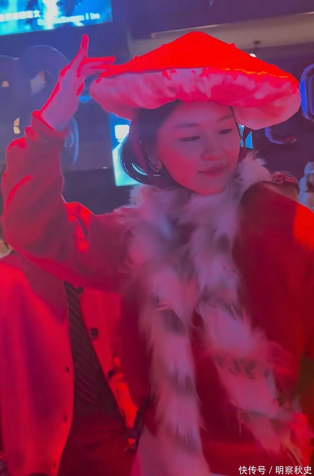 画面一排,就看到了金靖,刚生完孩子不久的她躯壳收复得可以,如故一如既往的搞怪。只见她头戴一顶夸张的红色帽子,戴围脖,穿红色上衣,下搭白色裙子,跳得十分参预。