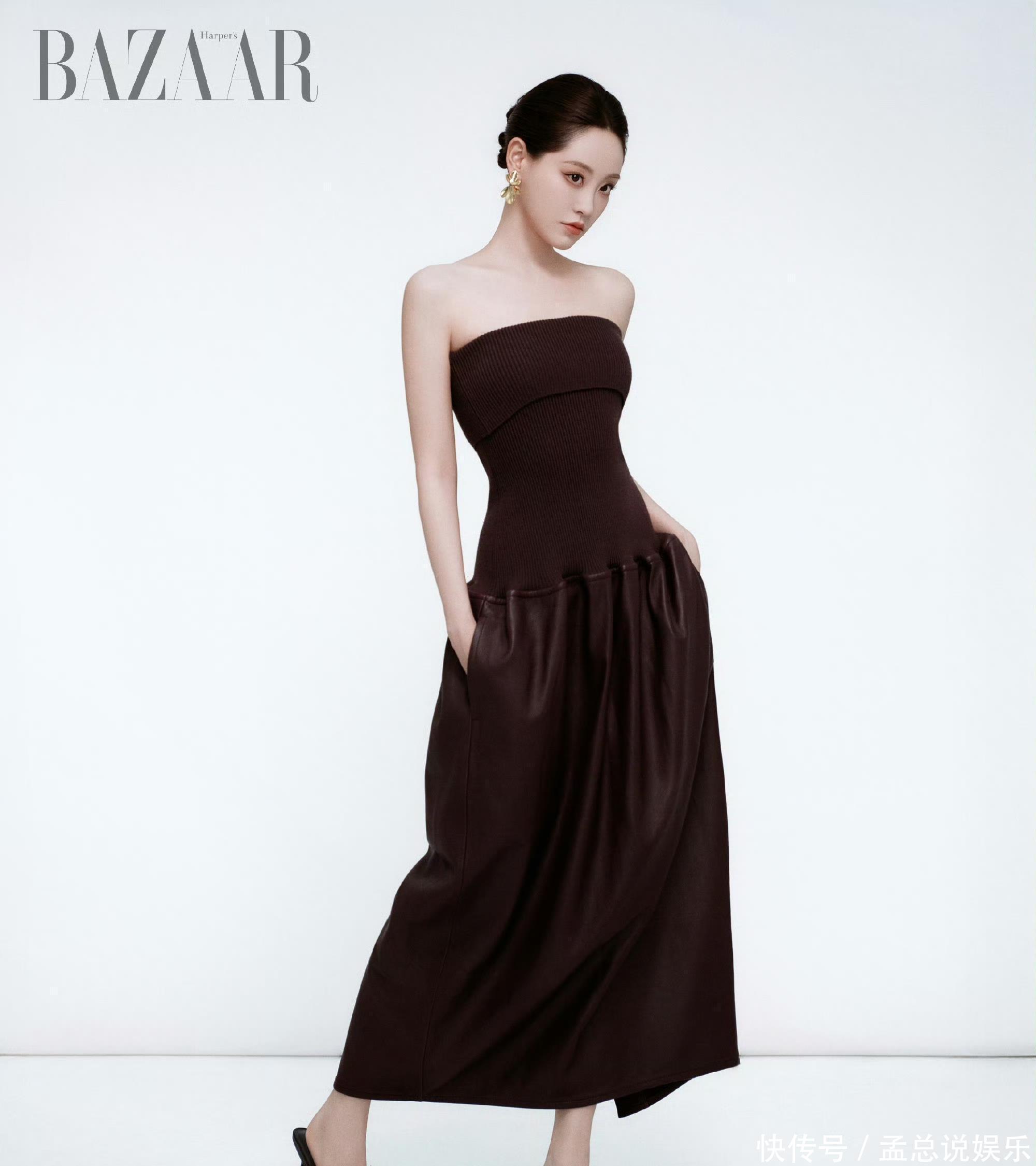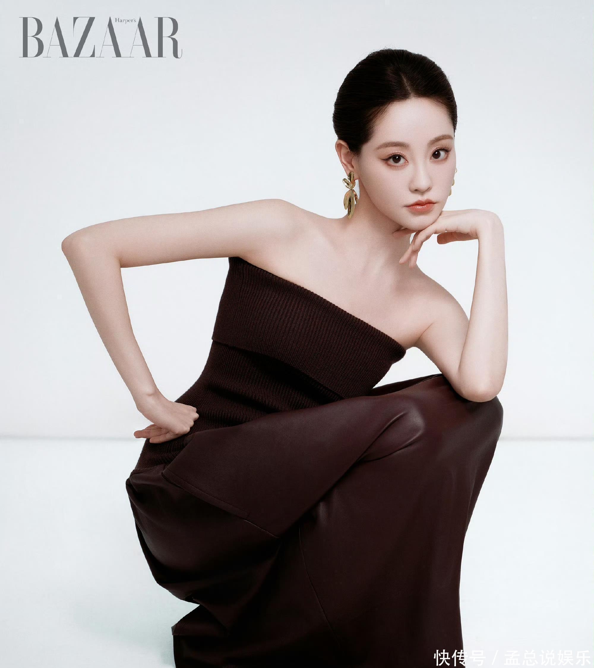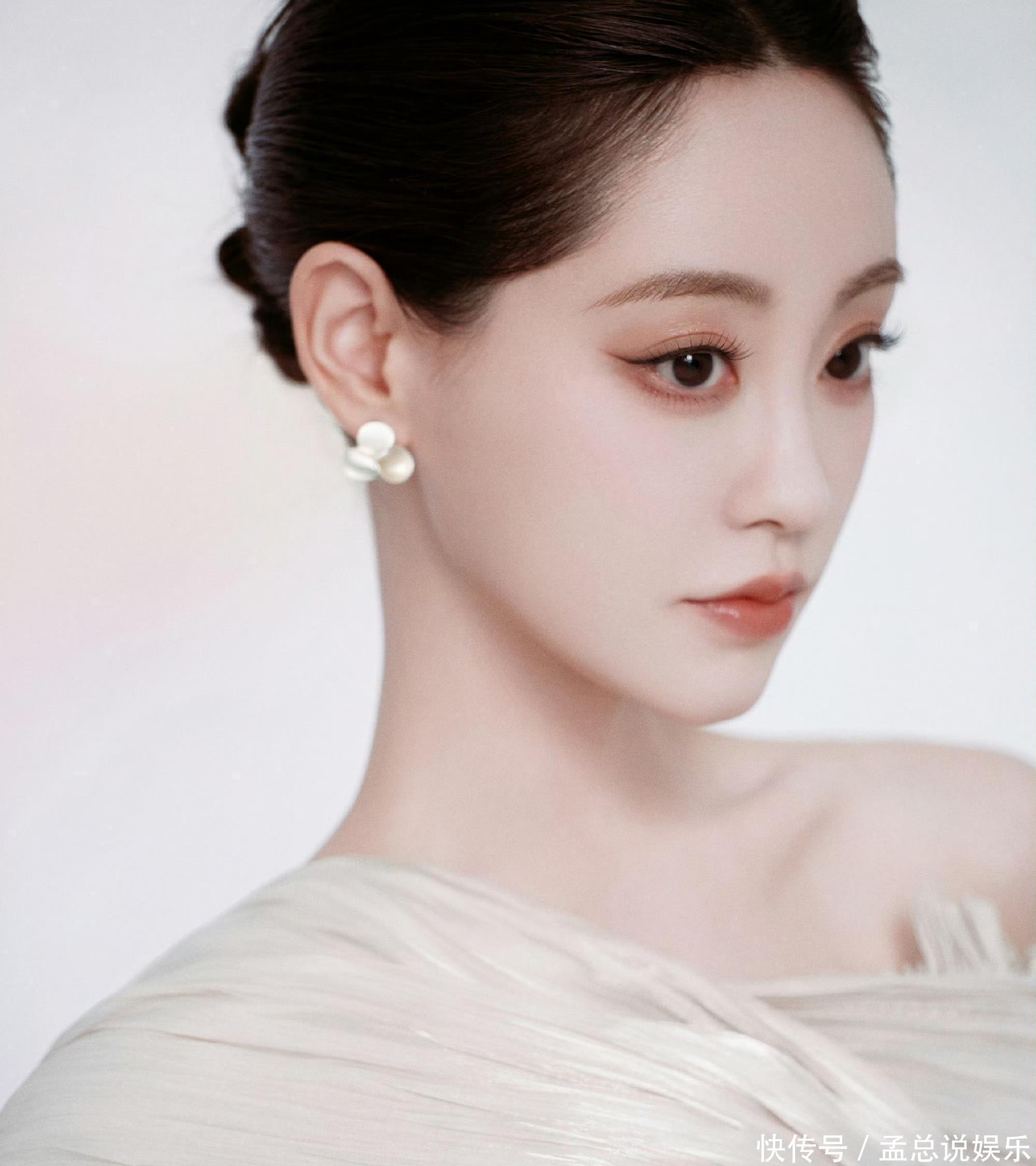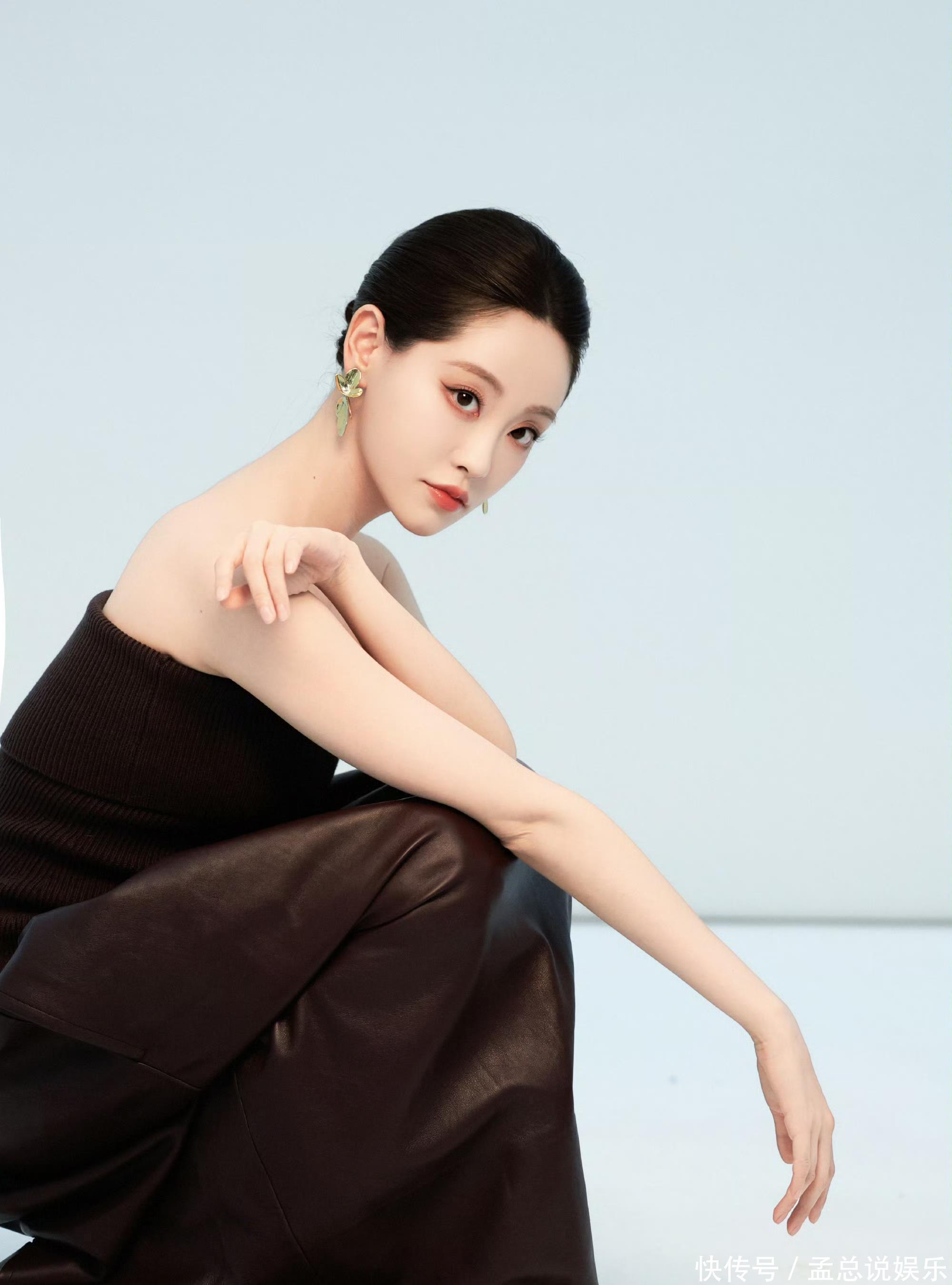 高髻发型贯通畅通下颌线,耳畔垂落着金属叶片耳环,极简配景更是突显她的弘大气场。
