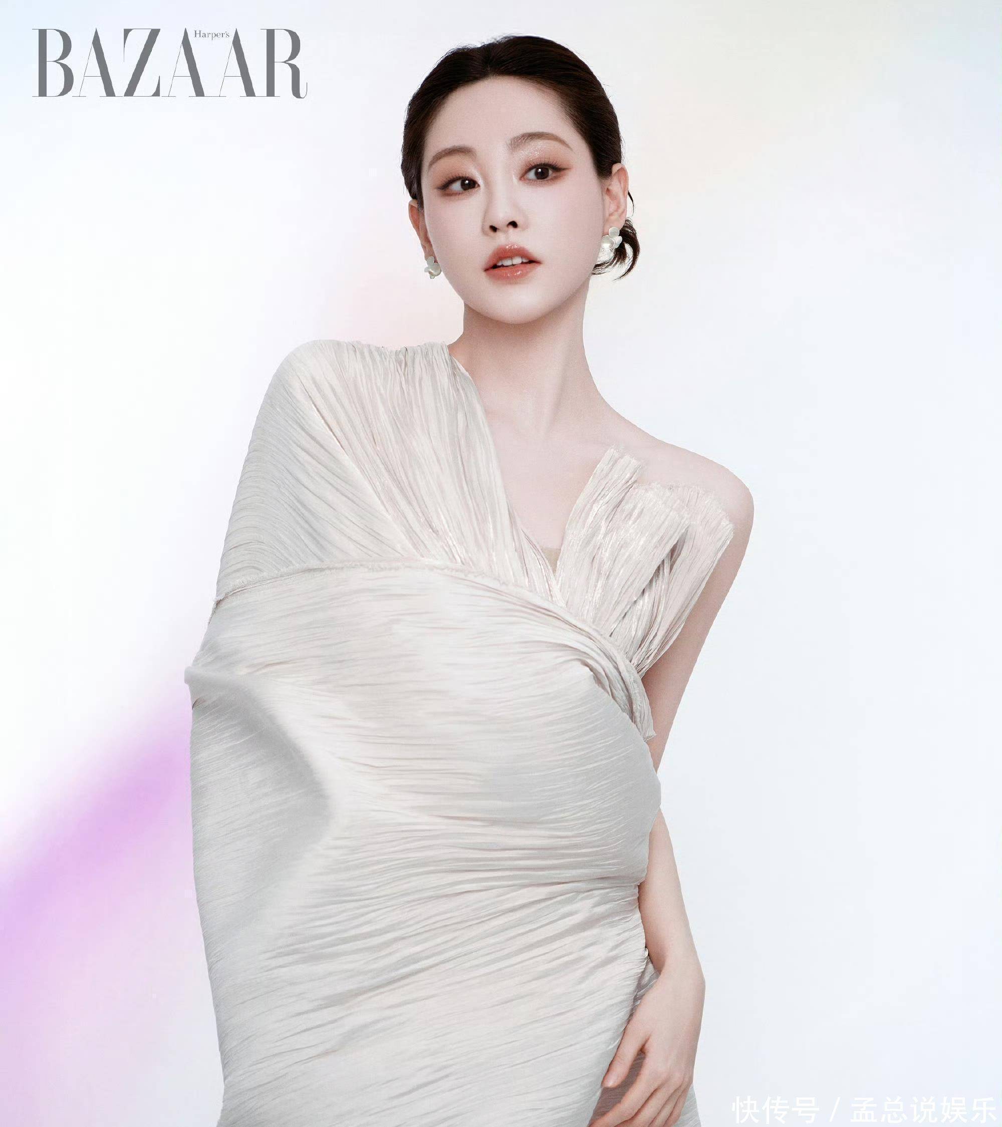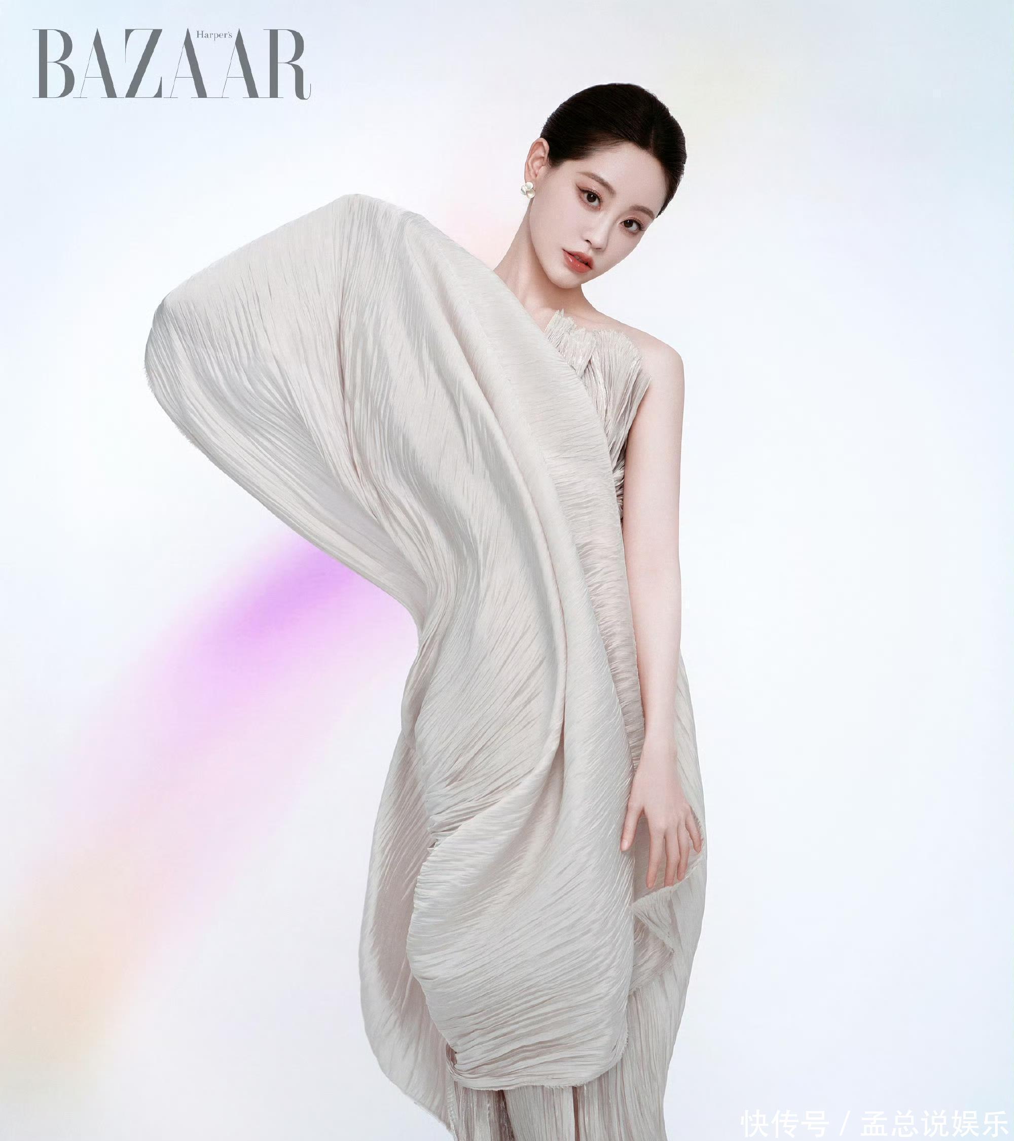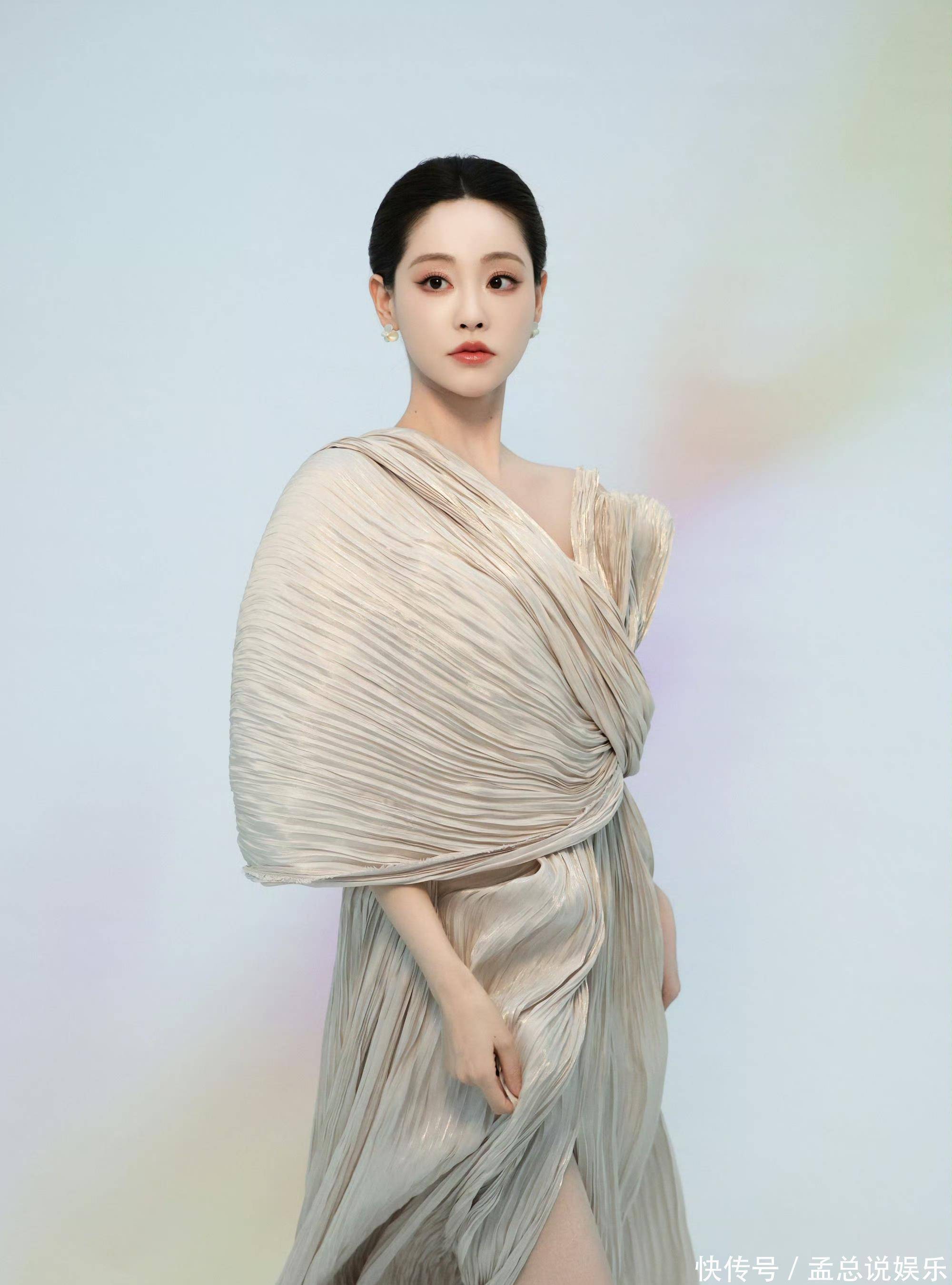 浅香槟色礼裙的立体褶皱档次丰富,单侧垂坠的大裙摆如流云舒展,光影下泛着致密珠光,裙摆开叉处若有若无勾画出修长腿部线条。