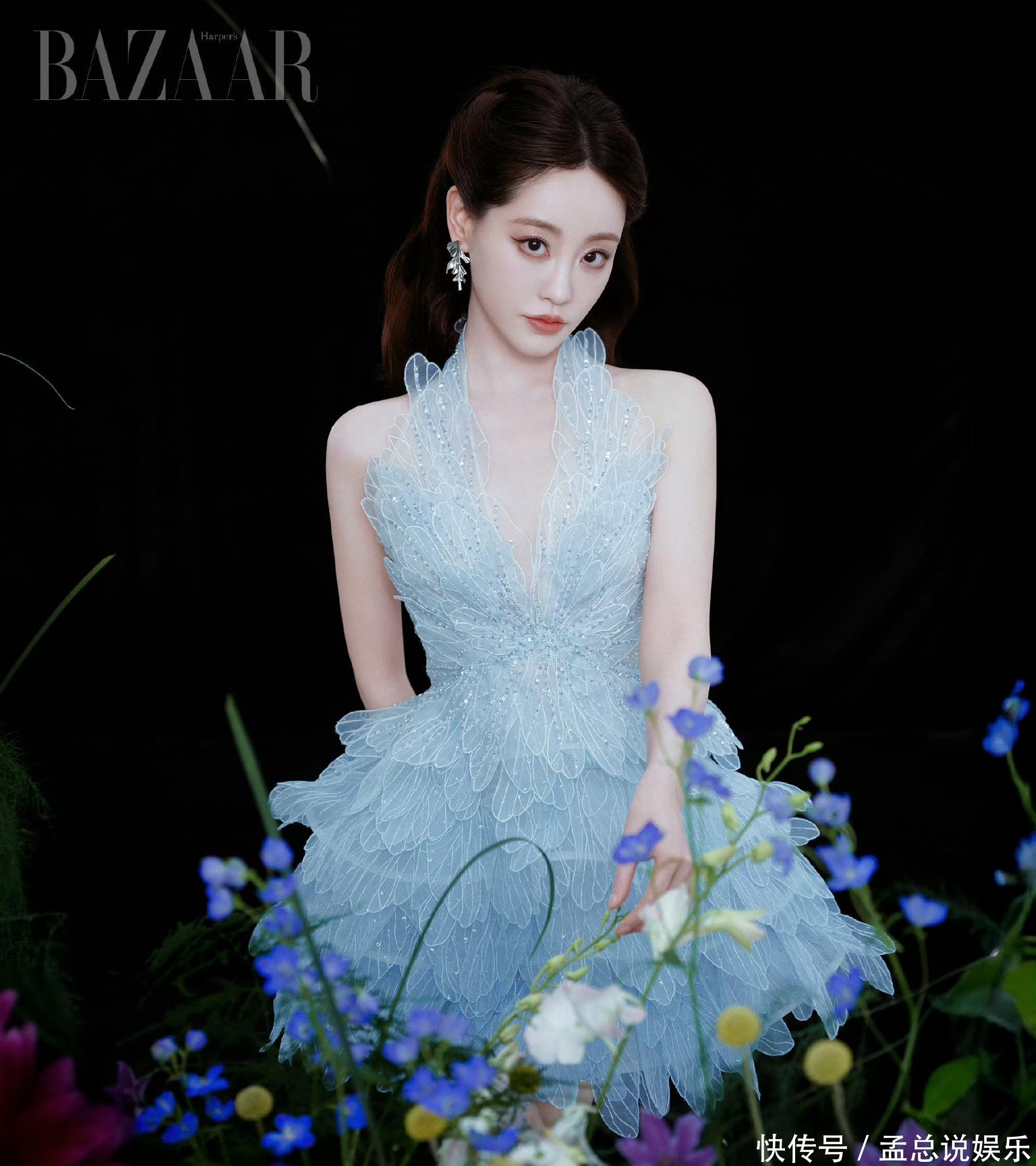 换上冰蓝色羽毛纱裙,宛如坠入暗夜花海的精灵。重重叠叠的羽毛纱织就蓬松裙摆,轻细如蝶翼,深V挂脖剪裁衬出畅通的肩颈线条,细碎闪钻杂沓点缀,在暗黑配景里漾开点点星光。