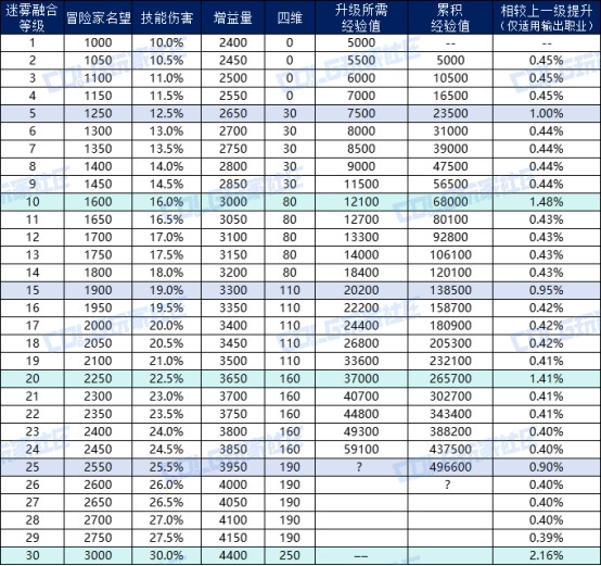 30级 (满级):妙技伤害+2%、增益量+200、冒险家名望+200、四维+60