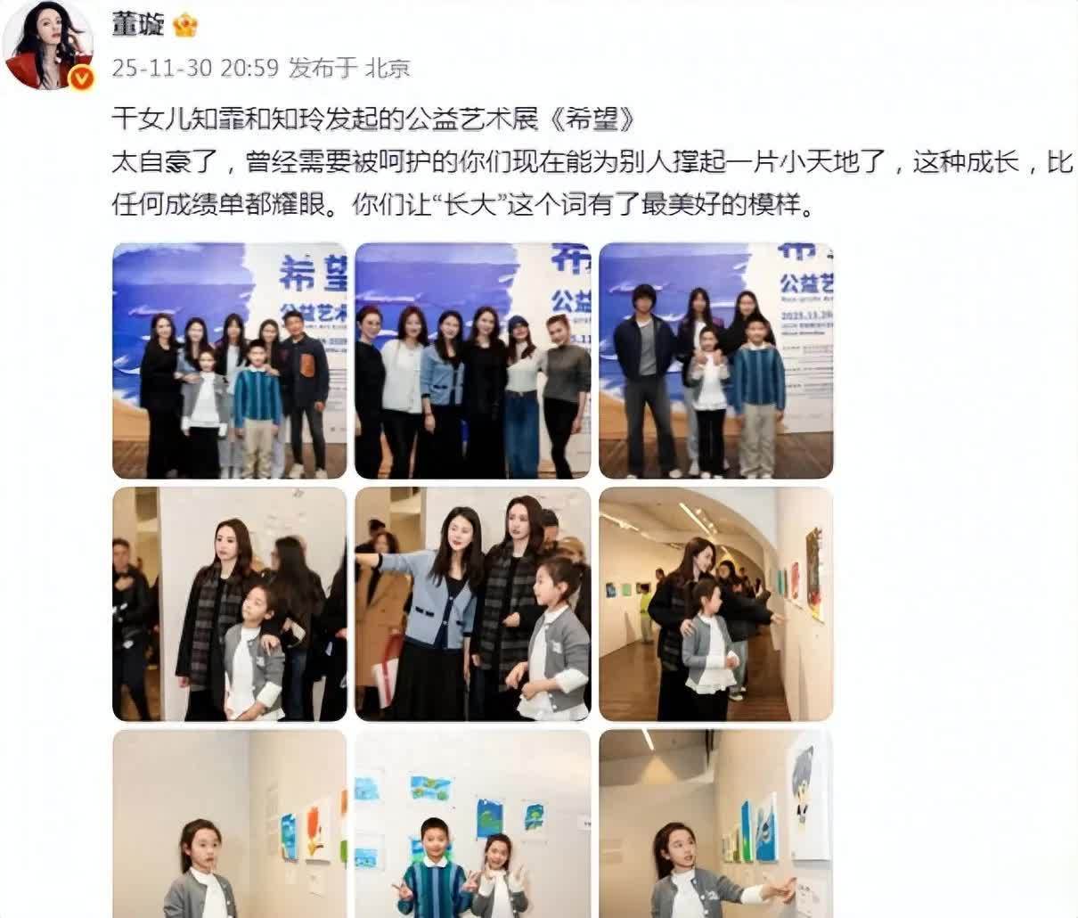 12月1日,演员董璇在个东说念主酬酢平台晒出一组与女儿小酒窝一同赶赴闺蜜关悦两位女儿举办的公益艺术展的相片,并感叹算作干妈的自重与欣忭。或者见证干女儿们的成长,董璇满心气象,温存话里有话。
