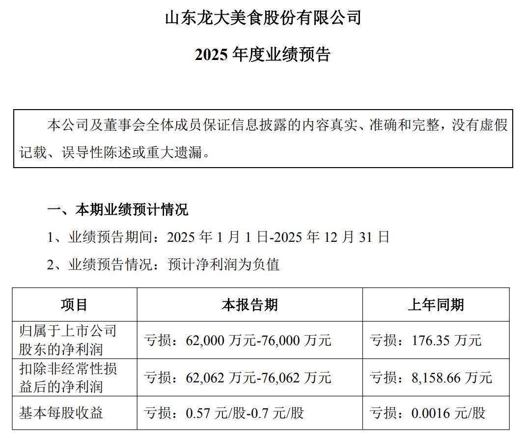 1月30日晚间,龙大好意思食(002726)密集发布公告。其中,在2025年度事迹预报中,展望2025年度归母净利润耗损6.2亿元至7.6亿元,上年同期耗损176.35万元。呈报期内,受行业周期影响,毛猪销售价钱及猪肉阛阓价钱捏续低位运行,公司传统业务板块出现较大耗损,同期,公司按照企业司帐准则的筹议花样对存货及生物质产计提了减值准备。