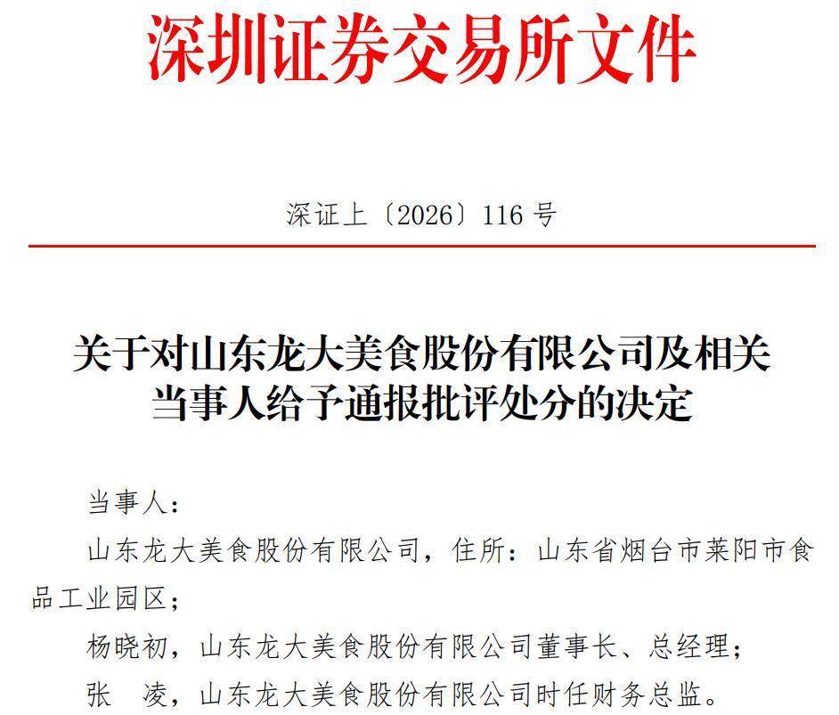 因上述非法事实,1月30日,龙大好意思食及董事长、总司理杨晓初,时任财务总监张凌还被深交所通报品评。