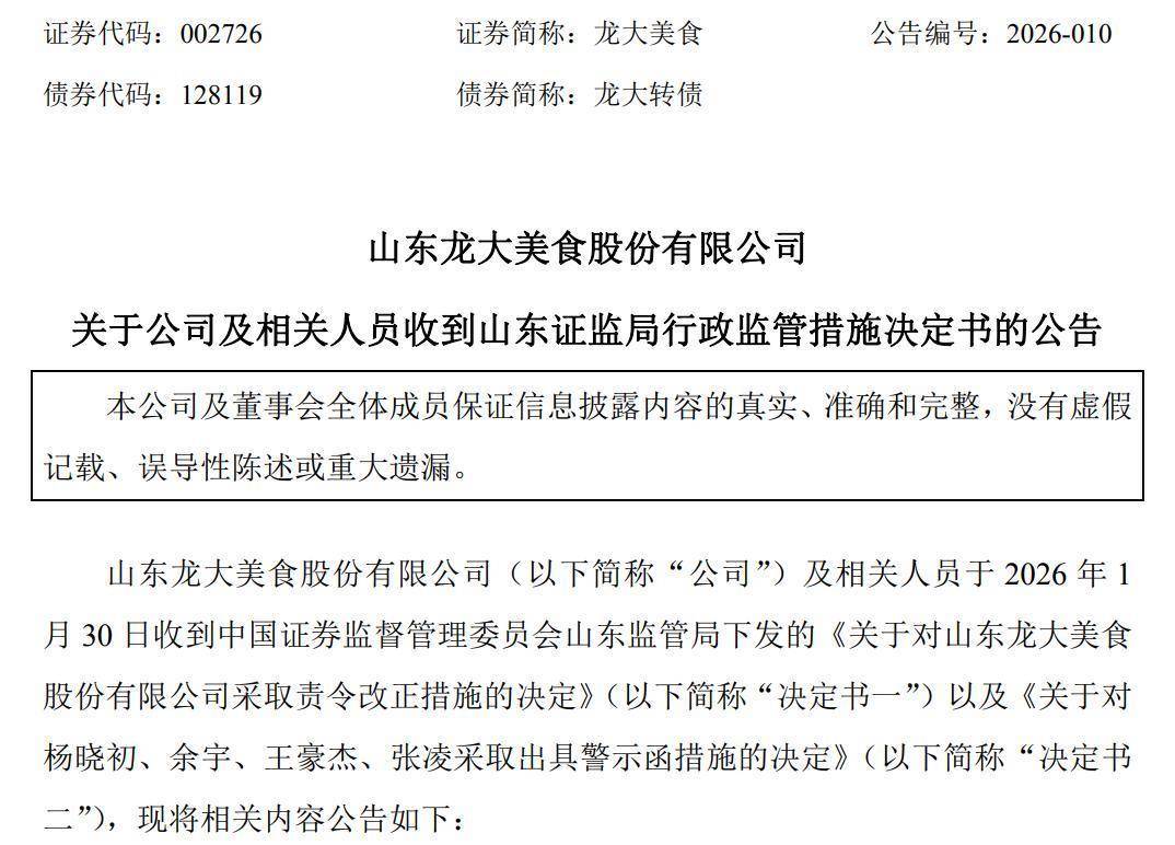 龙大好意思食今日还公告称,公司及筹议东说念主员于2026年1月30日收到山东证监局下发的《对于对山东龙大好意思食股份有限公司给与责令改正措施的决定》以及《对于对杨晓初、余宇、王豪杰、张凌给与出具警示函措施的决定》。