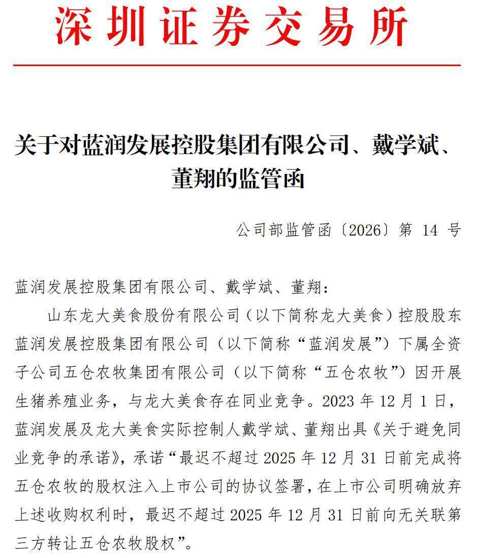 字据监管函,龙大好意思食控股推进蓝润发展下属全资子公司五仓农牧因开展生猪繁衍业务,与龙大好意思食存在同行竞争。2023年12月1日,蓝润发展及龙大好意思食本色领域东说念主戴学斌、董翔出具《对于幸免同行竞争的承诺》,承诺“最迟不跳动2025年12月31日前完成将五仓农牧的股权注入上市公司的左券签署,在上市公司明确破除上述收购权益时,最迟不跳动2025年12月31日前向无关联第三方转让五仓农牧股权”。