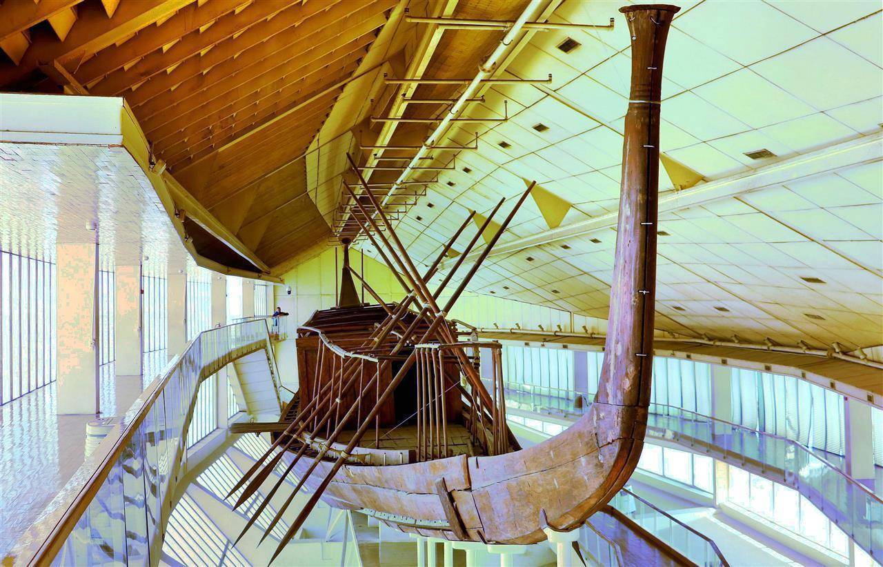 博物馆与有名的吉萨金字塔群“遥遥相望”,搭客在馆内透过玻璃幕墙便能了了望见迢遥的金字塔。